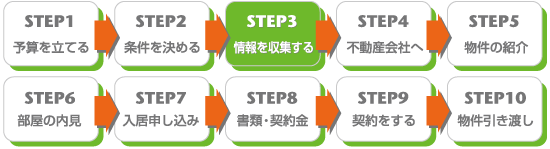• 自分の設定した予算などの条件が現実的なものかどうか、自分の出した予算そのものが世間の相場と比べてどうなのかを知るためにも、各不動産会社が開設しているホームページの物件情報やファックスサービス、各種住宅情報誌など、あらゆるメディアを駆使して、いろいろな情報を集めよう。そして集めた情報をもとにもう一度自分の希望する条件を吟味して、3つくらいまでに絞っておいた方がいいだろう。